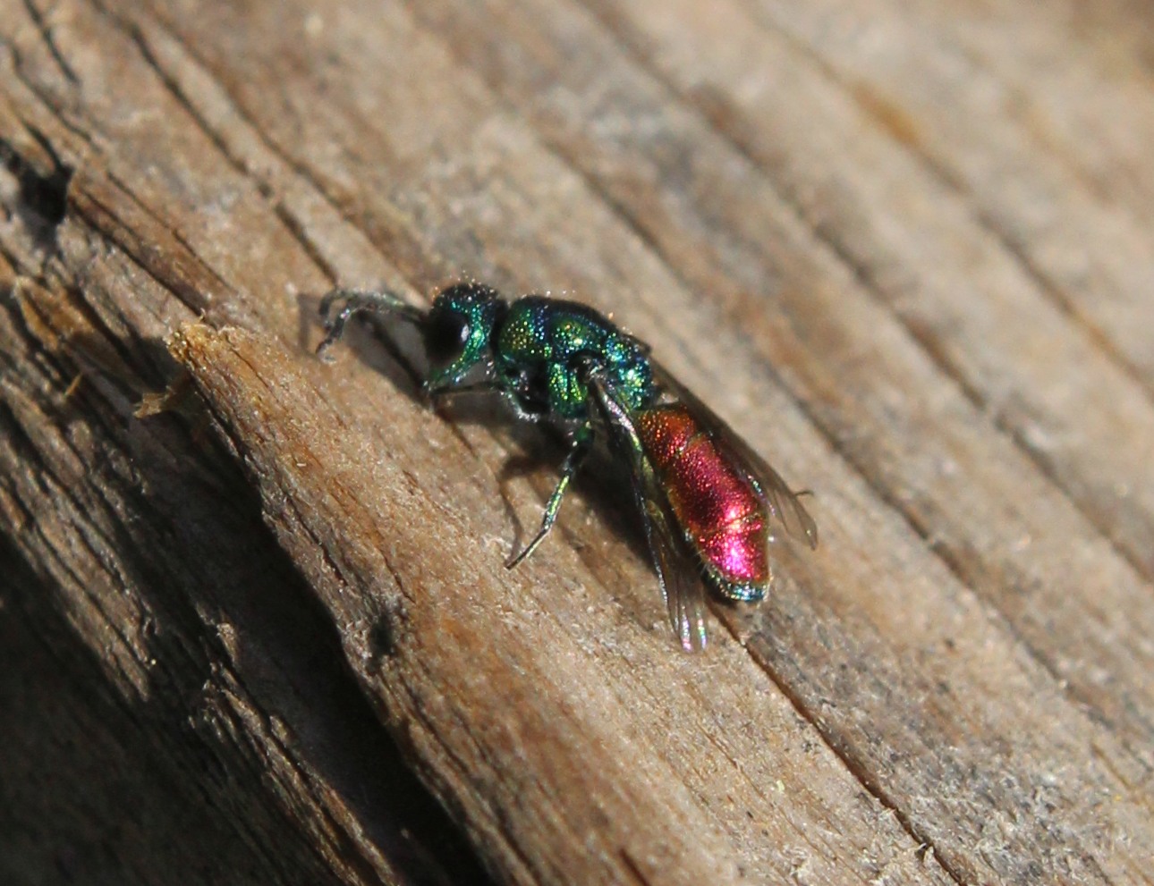 Die metallisch glänzenden Goldwespen – meistens von rot-grüner Farbe – sind Raubparasiten von Wildbienen, solitären Faltenwespen und Grabwespen. Im Bild eine Goldwespe aus der Chrysis ignita Gruppe sowie Chrysis spec. und Trichrysis cyanea (blaue Goldwespe).